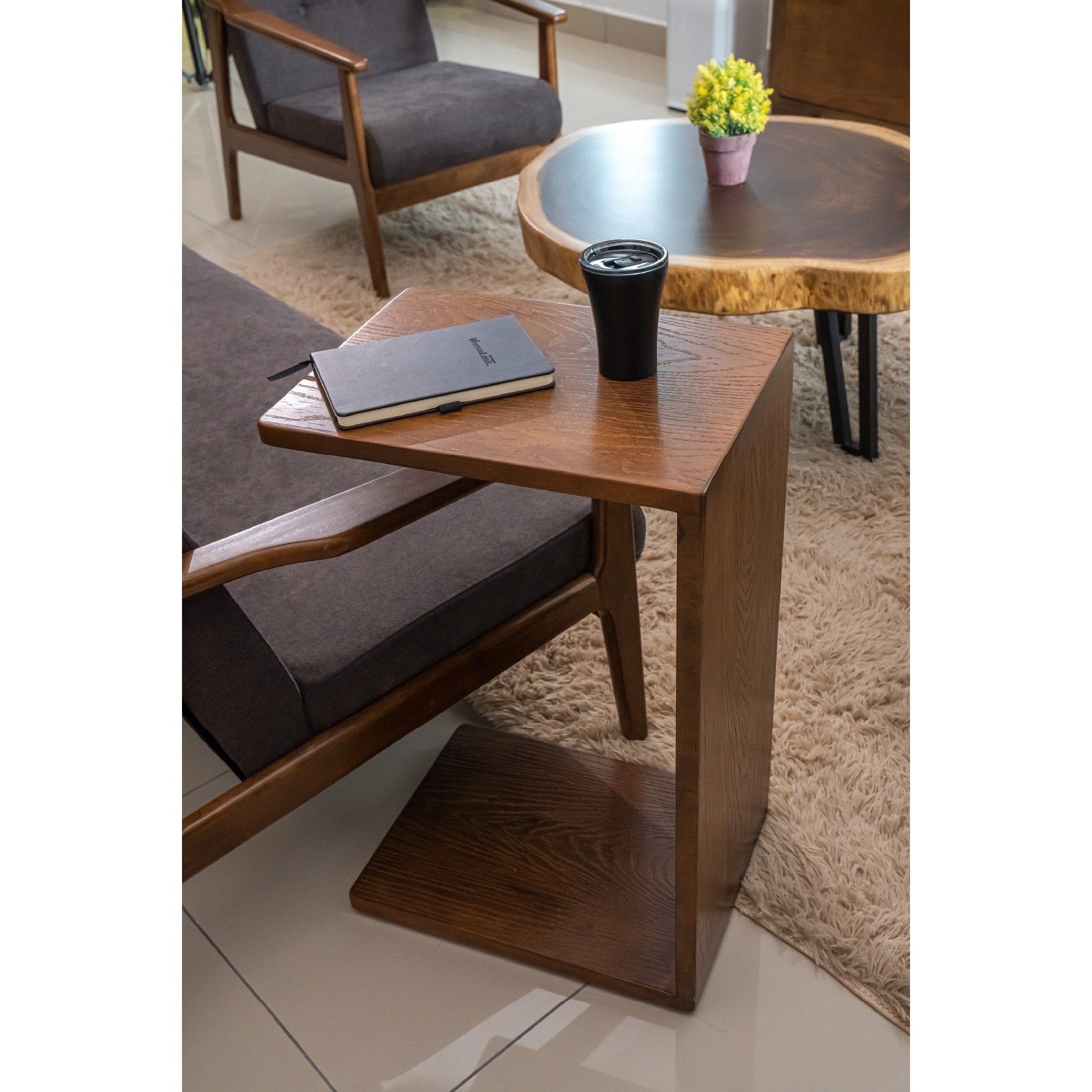 Pazzo is a C-shaped side table crafted from solid wood, designed for modern convenience—perfectly sliding over sofas to bring style and function right where you need it.